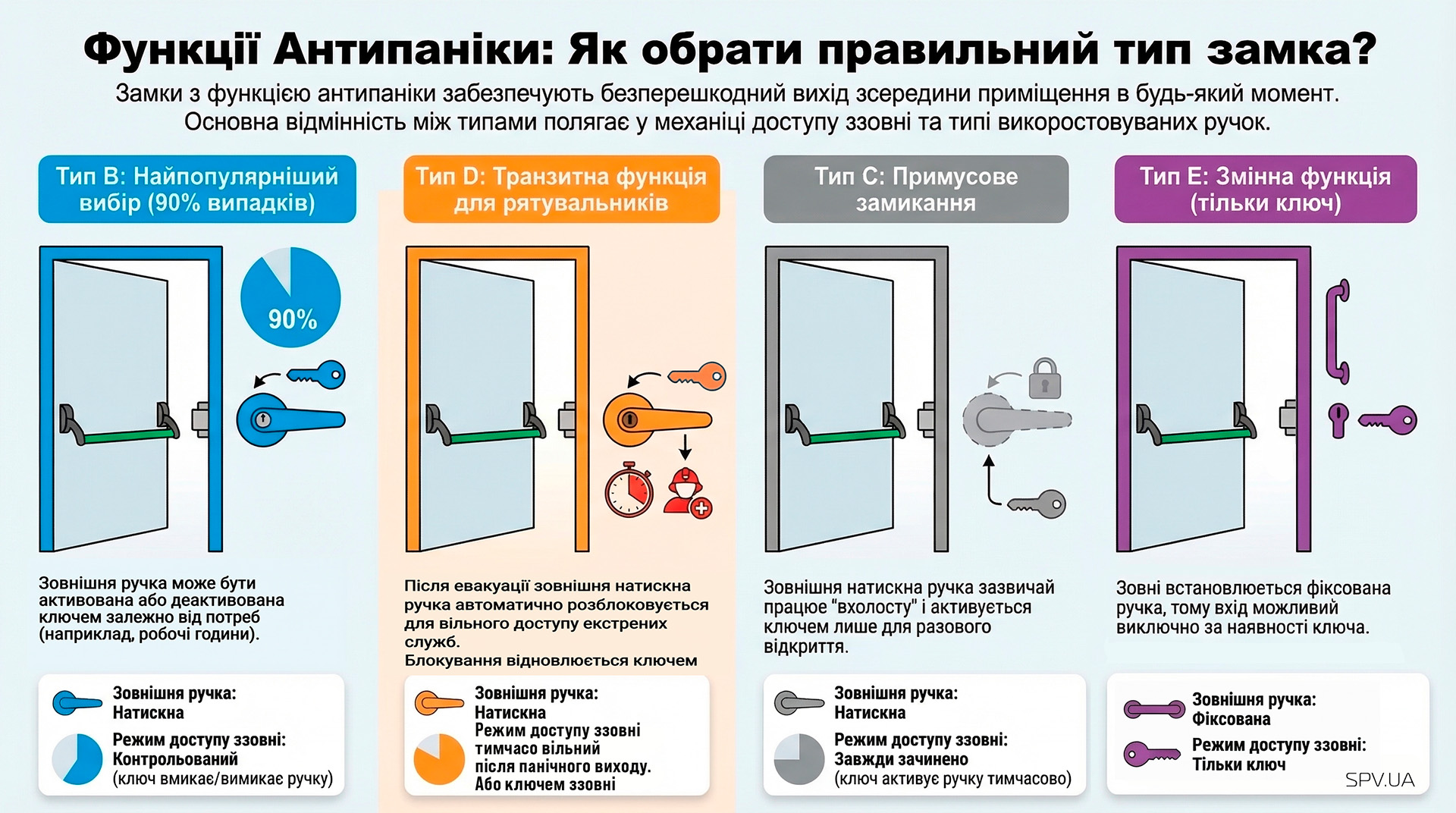 Варто наголосити, що панік-функція є незмінною характеристикою механічної конструкції врізного замка і має бути визначена до моменту закупівлі обладнання.