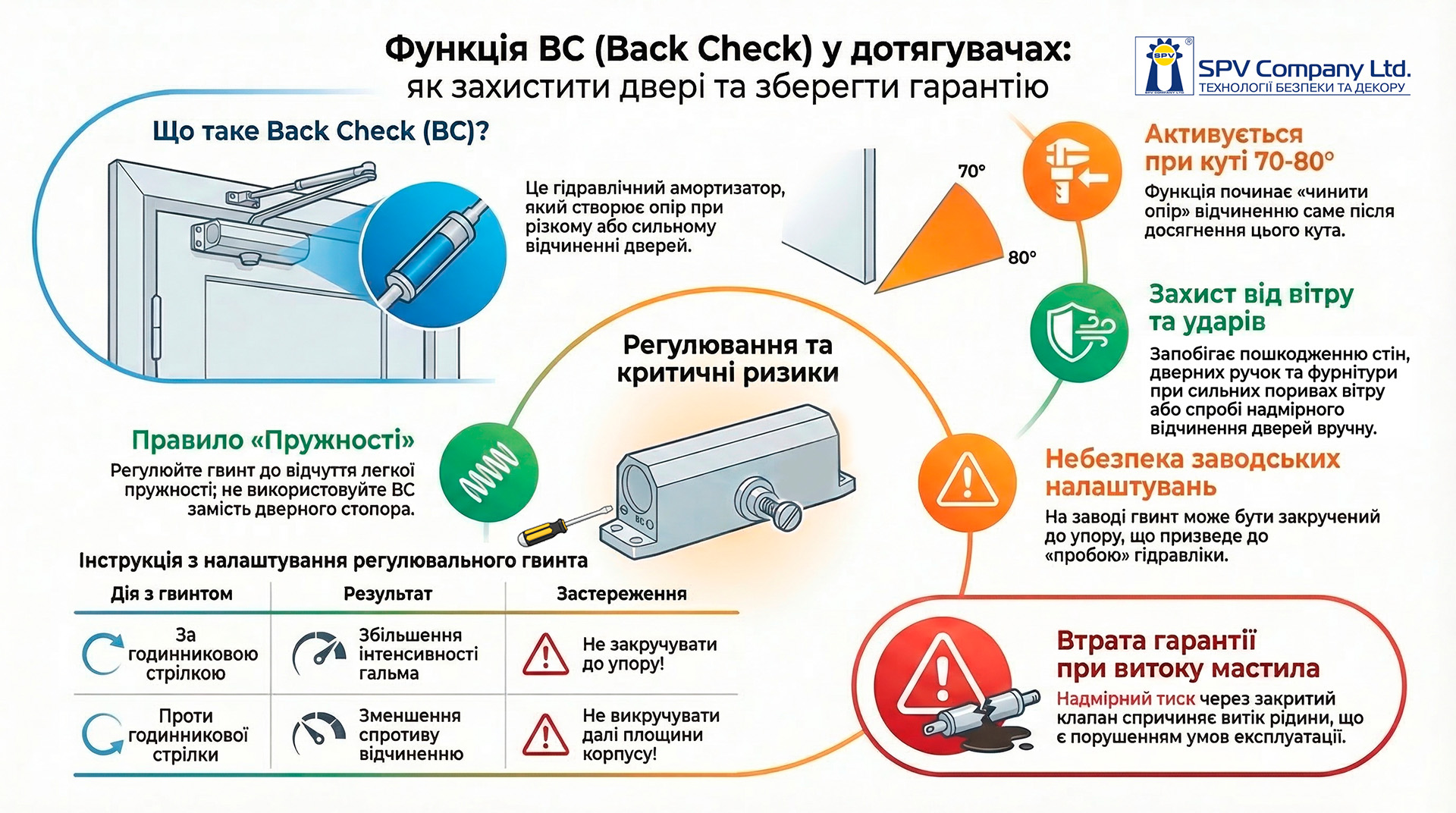 Функція BC (Back Check) у дверних дотягувачах: що це таке та чому важливе правильне регулювання