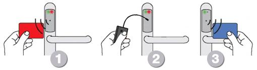 1) 2) 3) Поднять Программную карту к считывателю замка трижды. (Все карты пользователей удаляются из памяти замка.