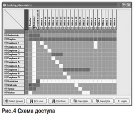 Поскольку объем памяти карт ограничен, в системе реализована возможность настройки «принудительного» считывания данных памяти событий с карт пользователей (Рис.3). Например, при активации функции «Does not open if openings overflow», пользователю будет отказано в доступе к offline точке прохода, к которой пользователь имеет право доступа, если память событий на карте полностью заполнена. Другой вариант «принудительной» модификации карты – настройка необходимости модифицировать ее с указанным интервалом времени. Администрирование прав доступа пользователей осуществляется путем внесения соответствующих изменений в схему доступа (Рис.4) с возможностью организации доступа по расписанию. Программное обеспечение Inhova позволяет создать 14 предопределенных временных зон, каждая из которых может содержать до пяти подзон (Рис.5).